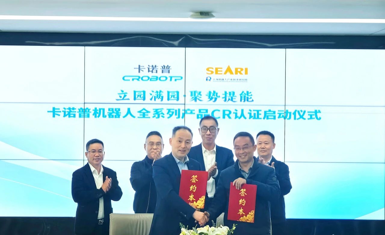随后,卡诺普机器人技术股份有限公司与上海电器科学研究所(集团)有限公司在卡诺普华月路产业园隆重举行全系列机器人产品CR认证签约仪式。