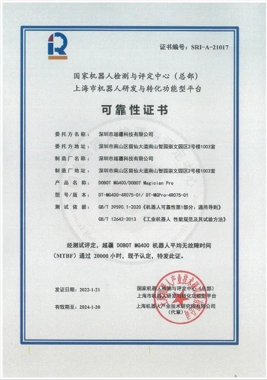 深圳市越疆科技有限公司的超小型桌面工业机械臂DOBOT MG400顺利通过MTBF 20000小时测评,获得可靠性证书。MTBF是衡量产品可靠性的关键指标,它反映了产品的时间质量,是体现产品在规定时间内保持功能的一种能力。越疆机器人在测试中的良好表现,是越疆科技一直以来坚持自主创新,坚定高质量发展的结果。