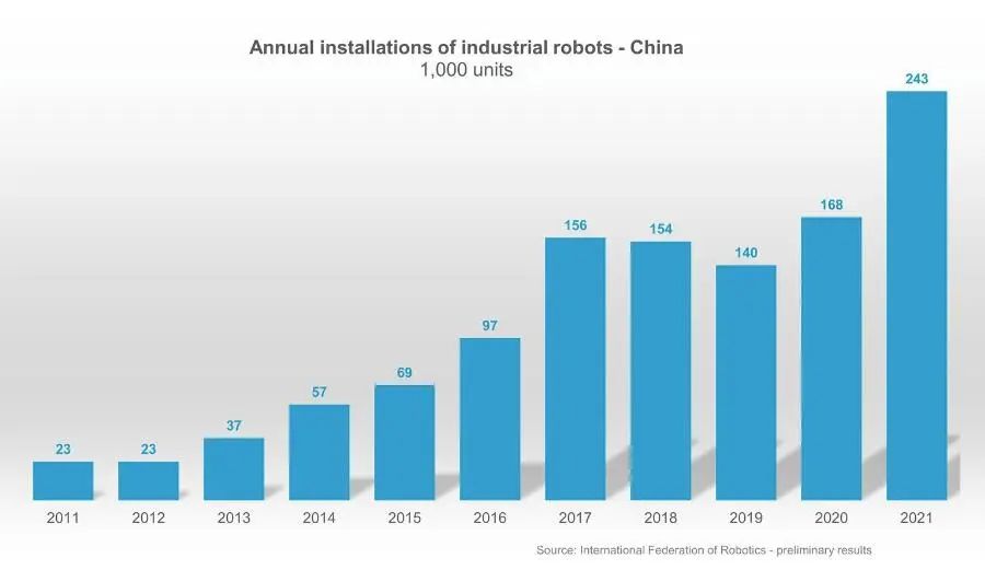 IFR公布2021年初步数据:中国机器人安装量增长44%