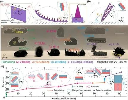 机器人在夹持运动中保持完全包裹的状态,可由磁铁绕z轴逆时针旋转驱动;当磁铁向前旋转时,机器人开始滚动起来;接下来,磁铁沿着y轴向下移动,并逐渐张开身体,恢复到初始状态,通过操作磁铁绕x轴顺时针旋转,机器人就会被翻转,为卸货做准备。此时地面上的机器人由其双腿支撑,可以通过类似夹持的动作执行货物释放。