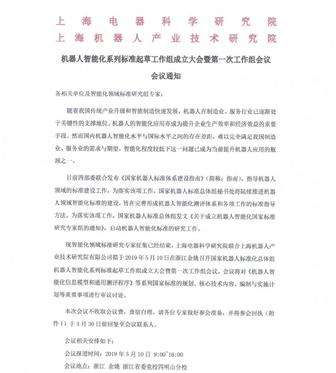 国家机器人标准化总体组机器人智能化系列标准起草工作组成立大会暨第一次工作组会议将于5月10日在浙江余姚机器人峰会同期举行。截至日前,已有60多位行业专家确认参会,在此真诚欢迎各位专家的到来。