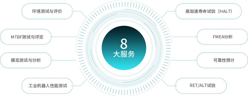 该服务基于研发与转化平台围绕机器人产品可靠性提升需求,提供可覆盖全寿命周期的设计可靠性、物料可靠性、制造可靠性、使用可靠性等测评与提升服务,具体服务项目包括环境测试与评价、MTBF测试与评定、模态测试与分析、机器人性能测试、高加速寿命试验(HALT)、FMEA分析、可靠性预计、RET/ALT试验等。